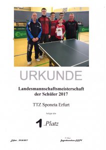 Am vergangenen Wochenende, 29. und 30. April 2017 konnten die Nachwuchsspieler des TTZ Sponeta Erfurt in heimischer Halle gleich doppelt abräumen. Sowohl die Schüler- als auch die Jugendmannschaft überzeugte!